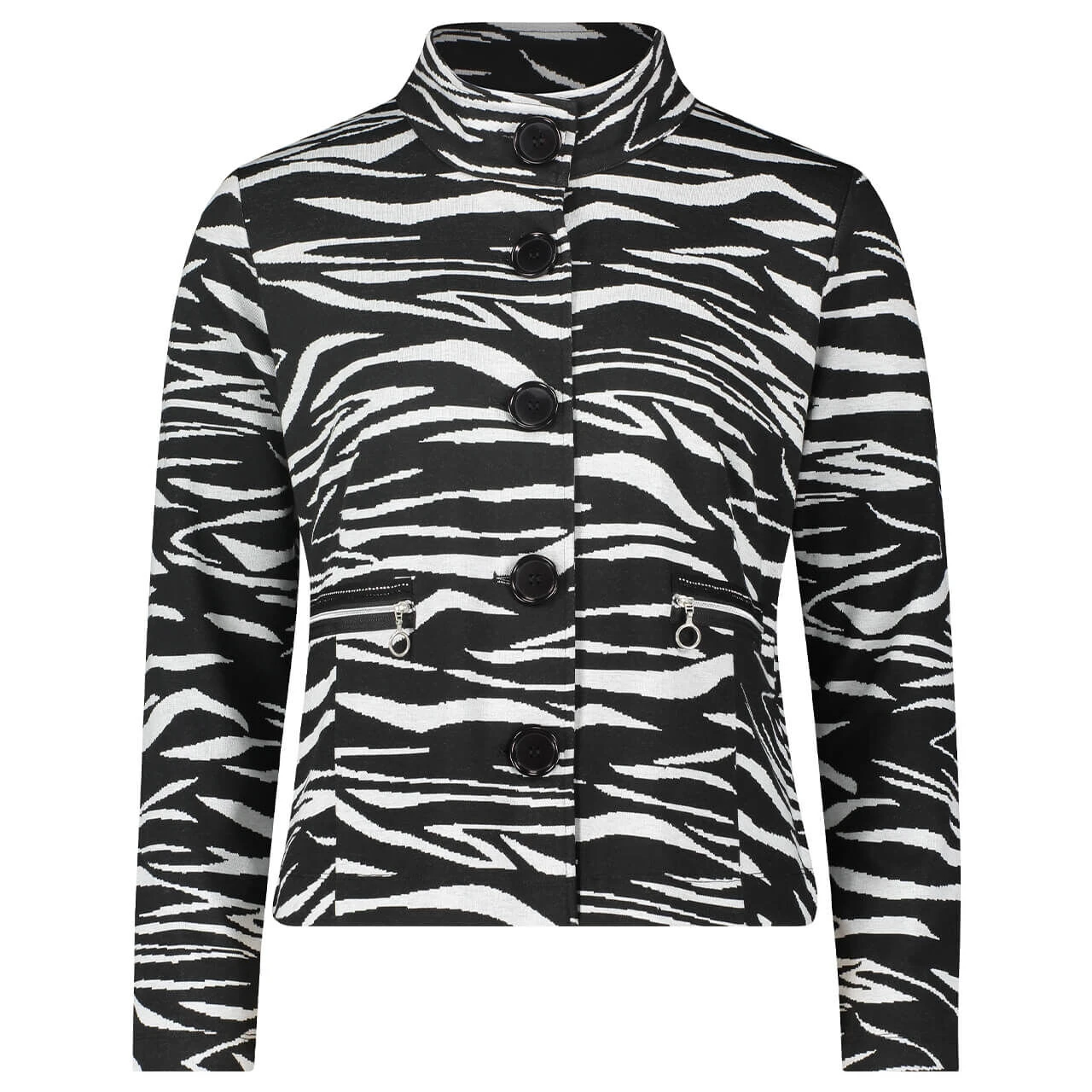 Gehen Sie auf Großstadt-Safari mit dieser Damen Shirtjacke von Betty Barclay! Das animalische Zebramuster wird durch dekorative Details wie die aufgesetzten, strassbedeckten Zipperleisten sowie die großen, schwarzen Knöpfe ideal ergänzt. Der softe Materialmix verleiht dem Damenoberteil zudem den perfekten Tragekomfort.