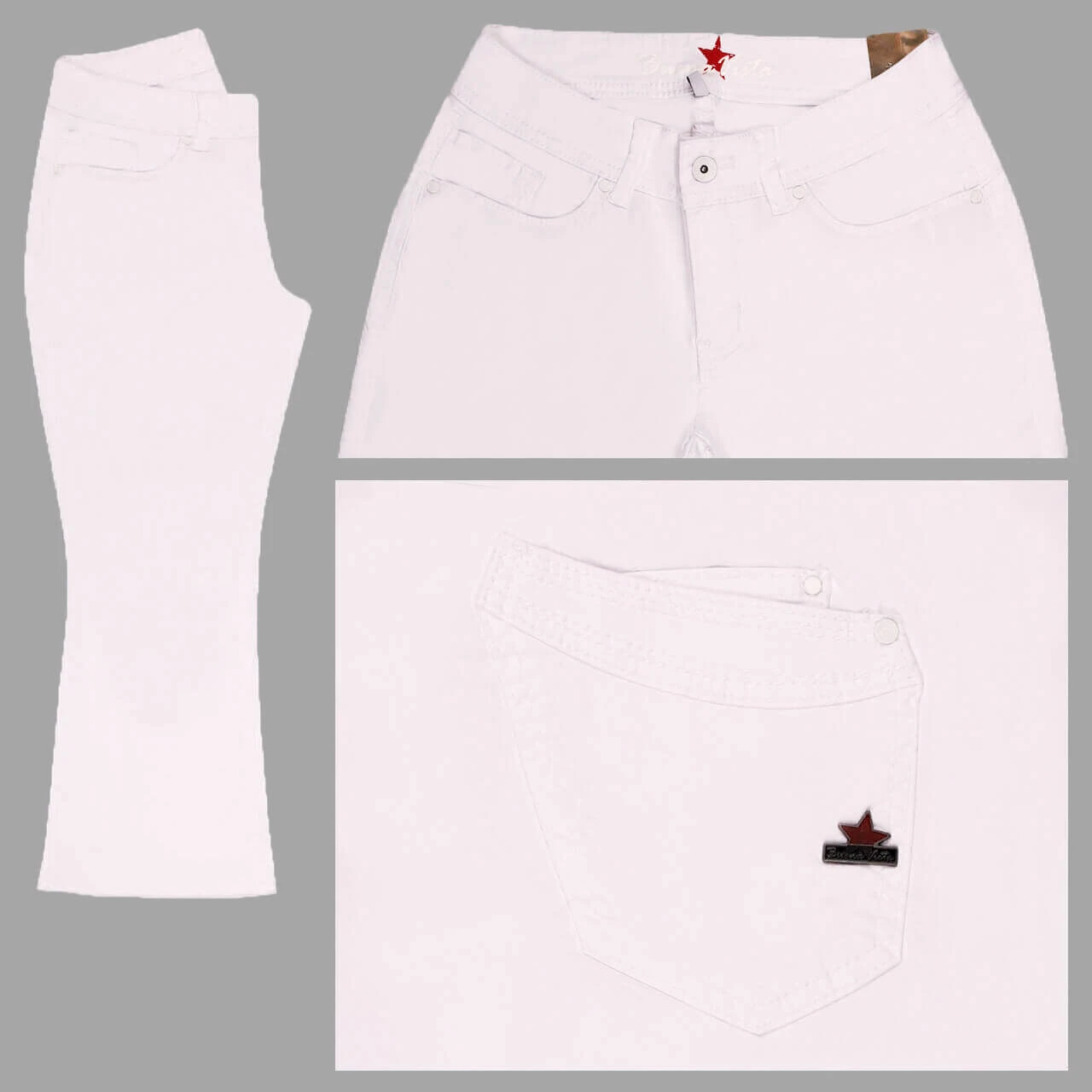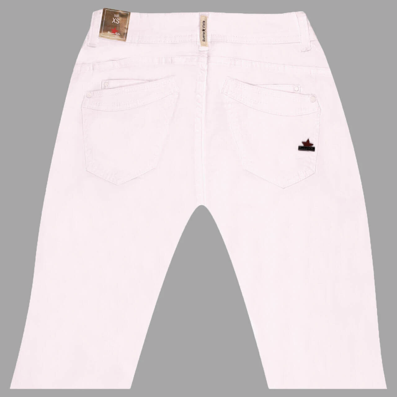Normalerweise mag die Buena Vista Malibu den Skinny Fit, doch die Variante Zip Easy Kick präferiert ein ausgestelltes Bein! Damit es besser zur Geltung kommt, ist es verkürzt und endet mit Fransen. Die schneeweiße Farbe kontrastiert der Metallstern auf der Gesäßtasche.