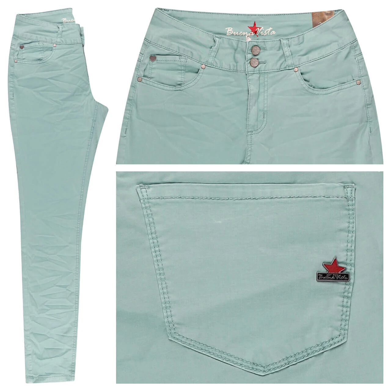 Die Buena Vista Tummyless lässt Ihre Figur geschickt glänzen und garantiert aufgrund des elastischen Stoffes auch ein optimales Tragegefühl. Zwei Verschlussknöpfe und das Markenlogo sind weitere Highlights der Hose im Five-Pocket-Style.