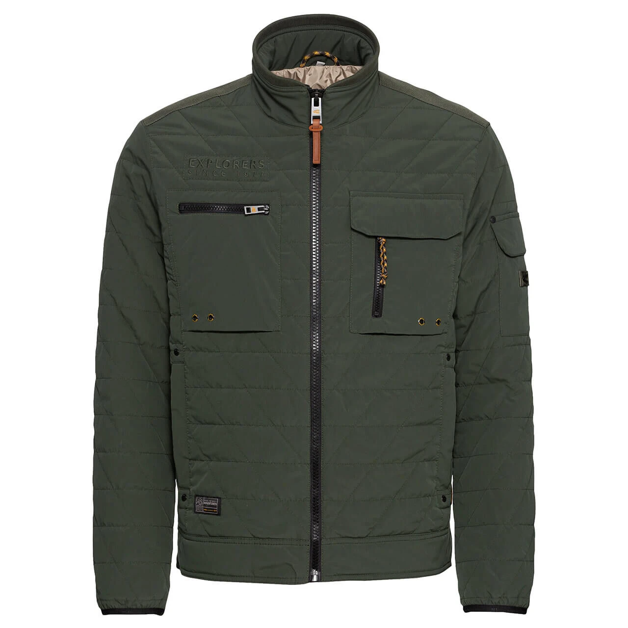 Taschen über Taschen finden Sie bei dieser Camel active Herrenjacke! Zwei Stück verbergen sich auf der Innenseite, eine finden Sie am Arm, drei auf der Brust und zwei an der Hüfte. Die gelben Details, die Sie zum Beispiel an den Zippern finden, sind ein Markenzeichen des Labels. Die gesteppte Übergangsjacke mit Rippbund am Stehkragen hat insgesamt eine sportive, kernige Optik.