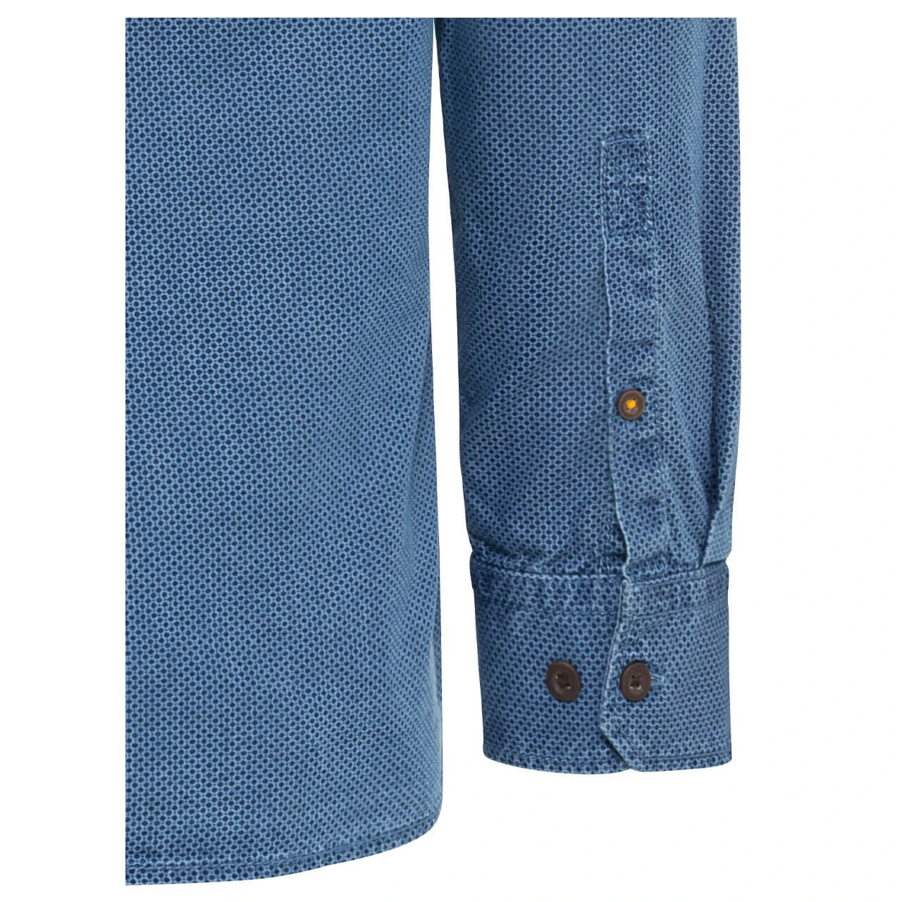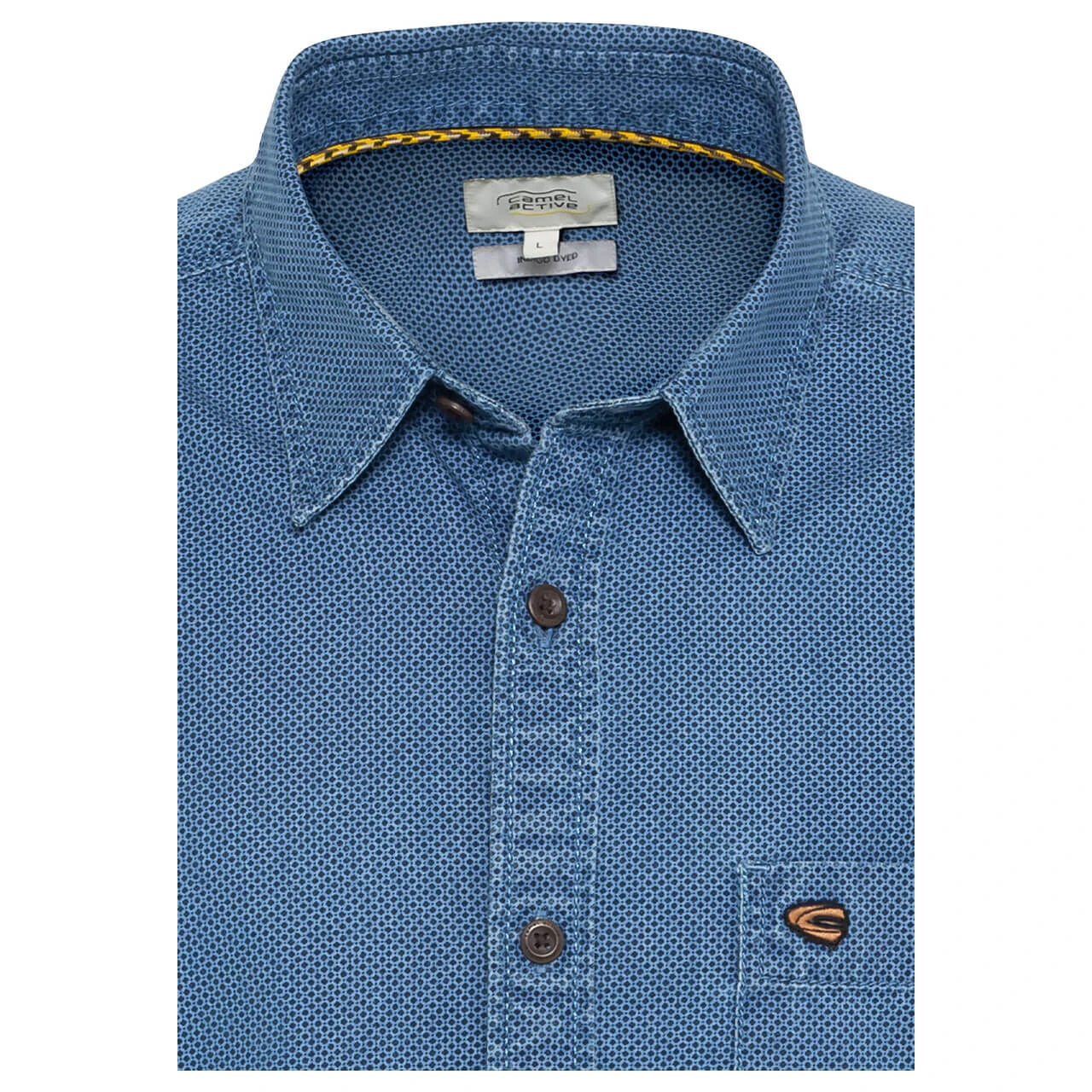Um das schlichte Blau aufzupeppen, kombiniert das Camel active Herrenhemd einen tonalen Alloverprint dazu. Dunkle Knöpfe und ein gesticktes Logo an der Brusttasche bringen Brauntöne ein.