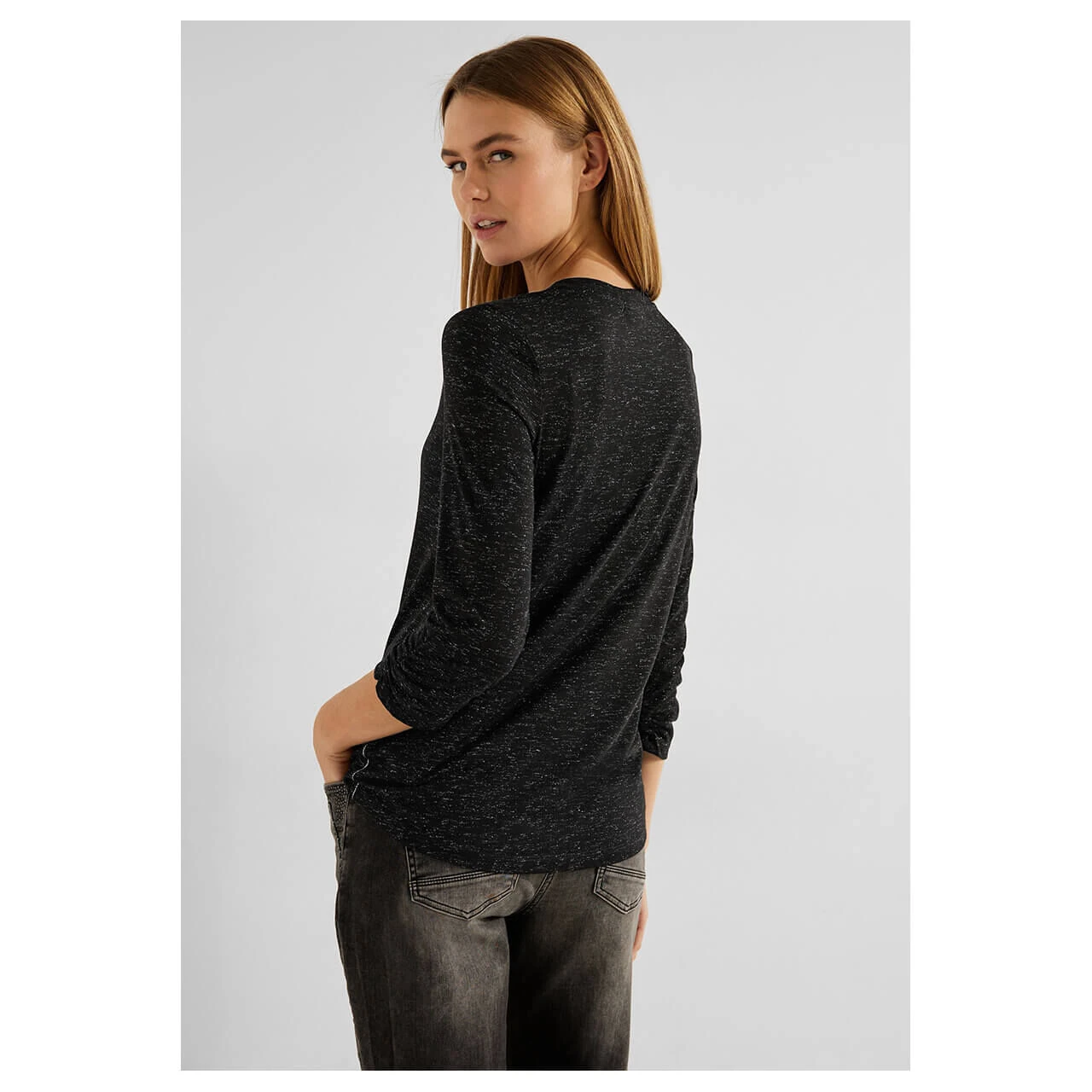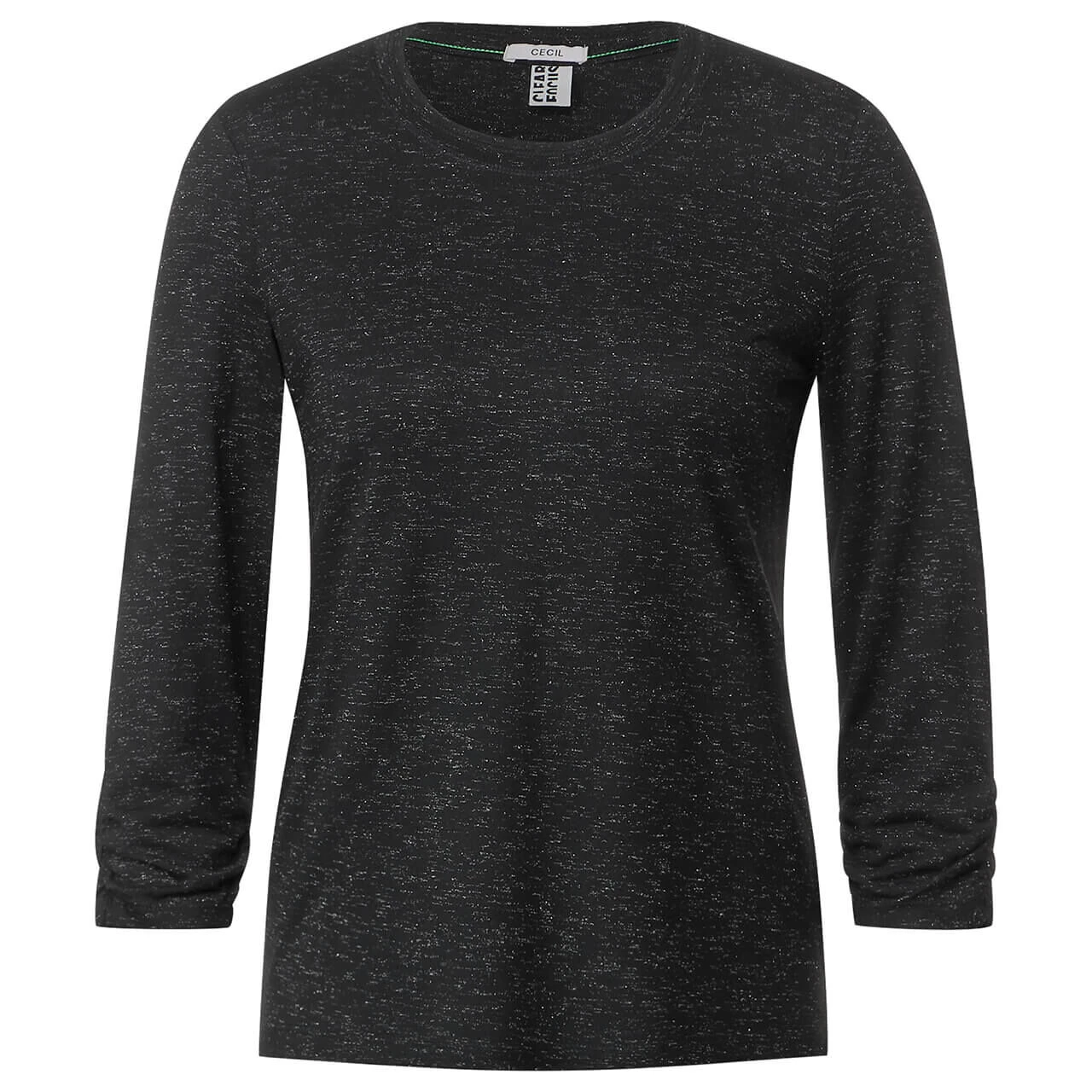 Glitzernde Akzente! Das Damen Shirt von Cecil mit gerafftem 3/4 Arm, Rundhalsausschnitt und in zarter Melange-Optik ist ein echter Hingucker. In softer Jersey-Qualität bringt es mit seinem funkelnden Design etwas Glamour in Ihren Alltag.