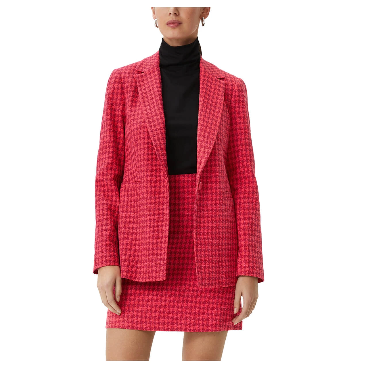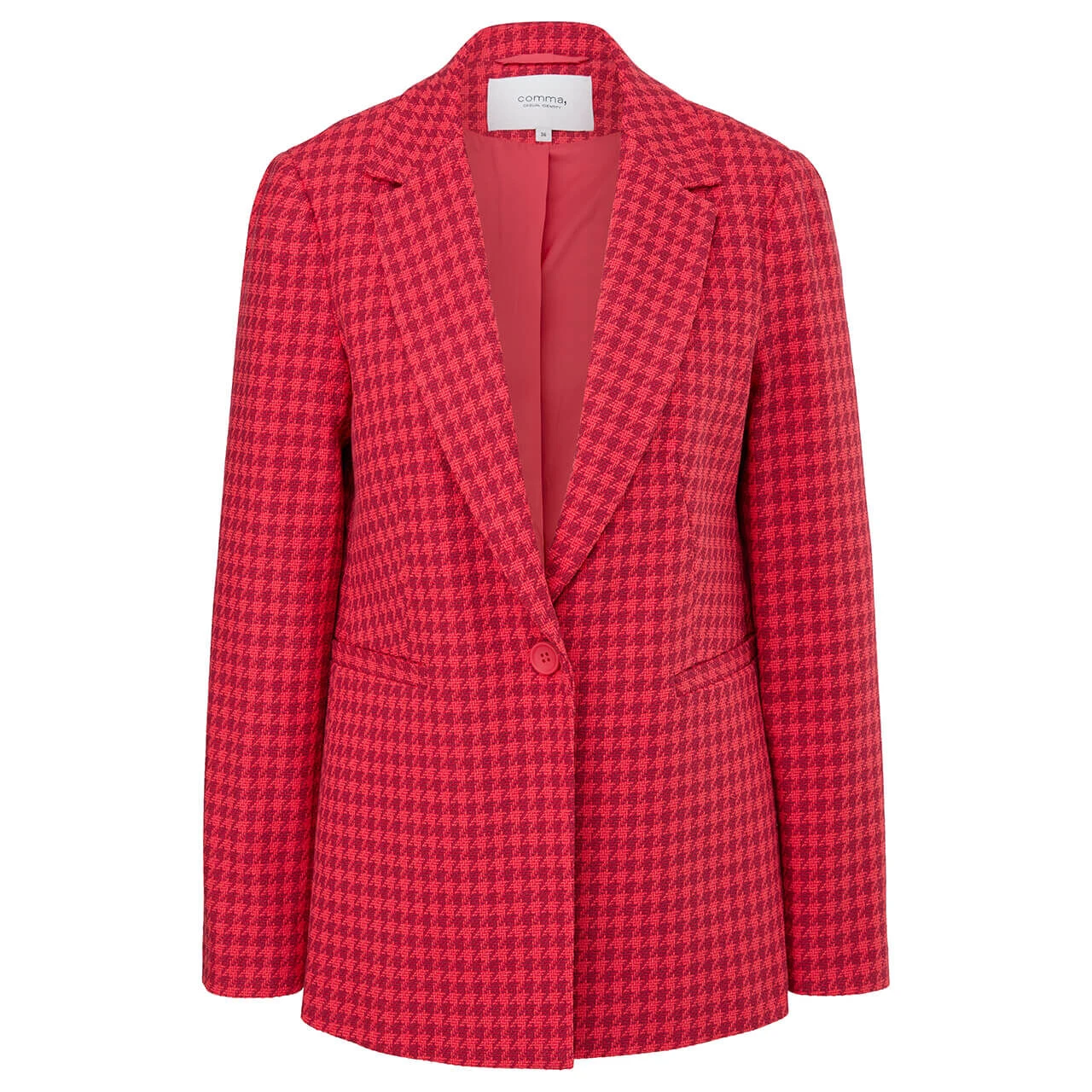 Für einen unauffälligen Look ist der Comma Blazer nichts! Die Jacke hat ein pinkes Hahnentrittmuster, das Modebewusstsein bei der Trägerin voraussetzt. Das Material ist weich, hat aber eine fühlbare Struktur. Mit einem leicht taillierten Schnitt und Reverskragen bleibt der Schnitt des Blazers klassisch.