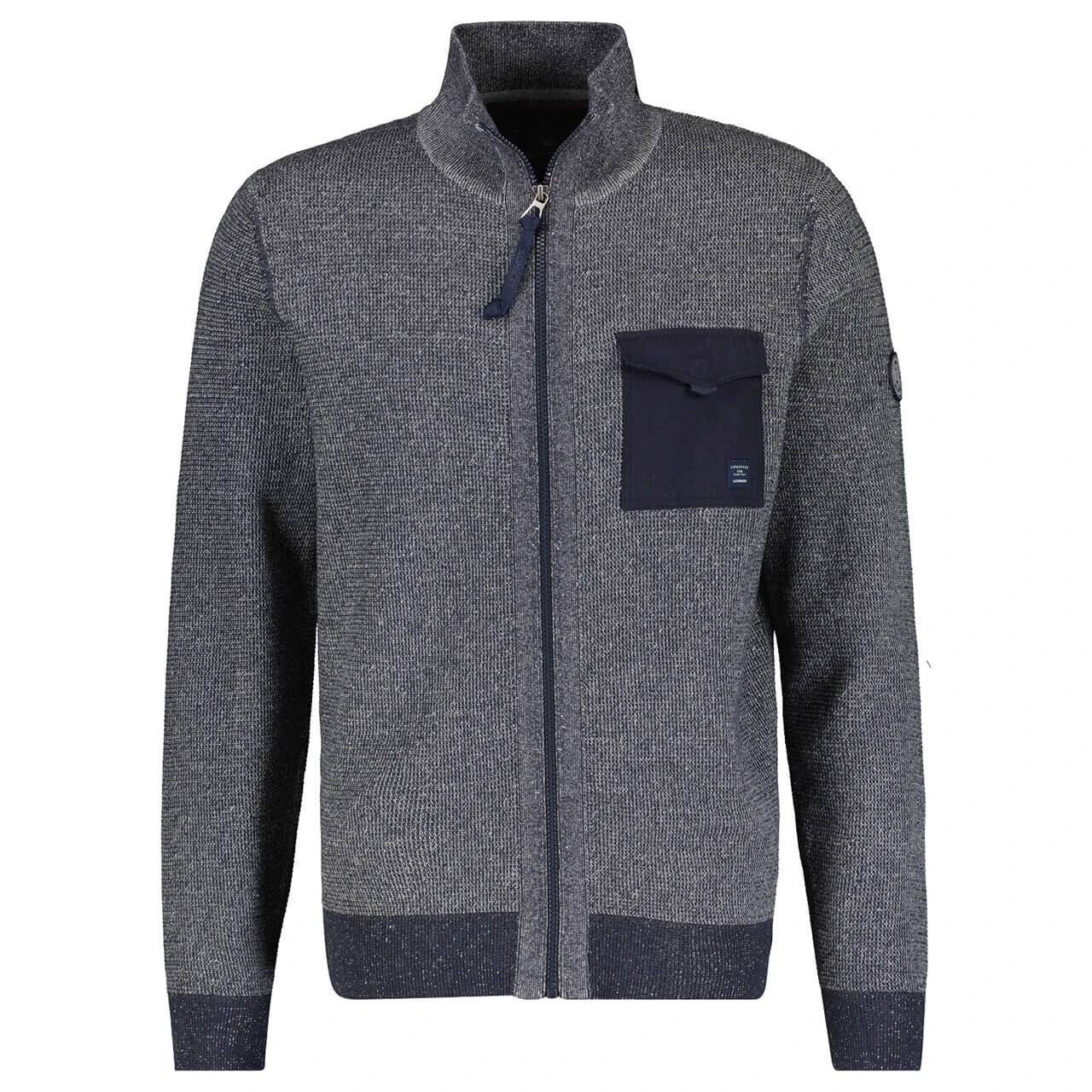 Die kernige Lerros Herrenjacke in modischer, lebendiger und kontrastfarbiger Strukturoptik punktet mit geripptem Troyerkragen und Saumabschlüssen. Die hochwertige Strickjacke aus nachhaltig produzierter Baumwolle und die aufgesetzte Brusttasche runden den sportiven Style perfekt ab.