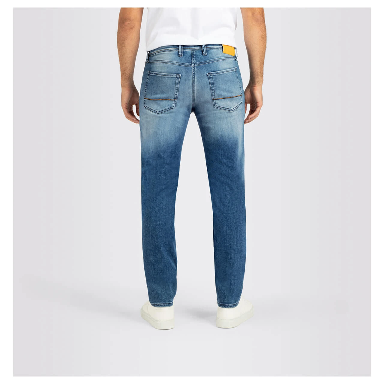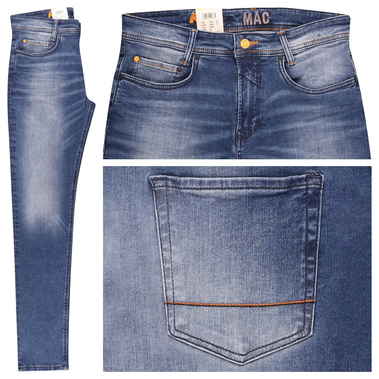 Die Herrenjeans MAC Flexx setzt Kontraste! Verschlussknopf, eine Niete auf der Münztasche, Markenpatch und je eine Naht am Bund sowie auf den Gesäßtaschen sind in leuchtendem Orange gehalten und verleihen dem Denimblau dadurch einen noch intensiveren Eindruck. Das hochwertige Stretchmaterial sorgt derweil für einen allseits bequemen Sitz.