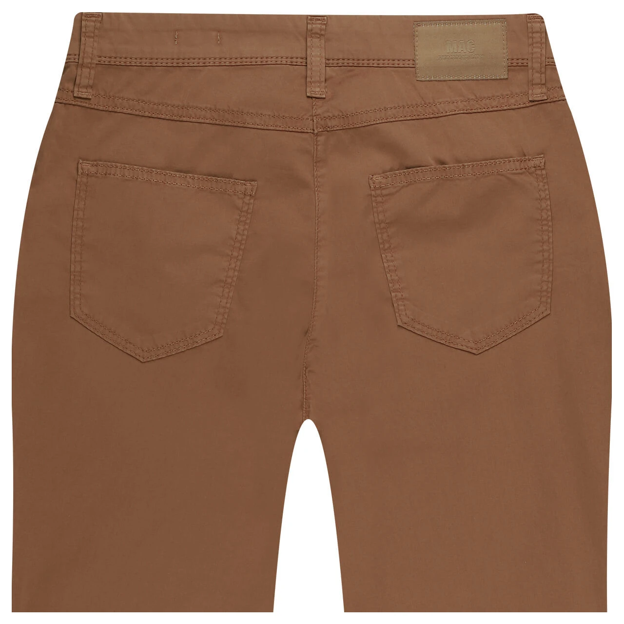 Die Liebe zur Schokolade kann man auf verschiedene Weisen ausdrücken – unter anderem mit der MAC Melanie! Die braune, leichte Damenhose ist eine kleine Hommage an die Süßigkeit. Ein dezent goldfarbener Hosenknopf und ein Stoffpatch mit Markennamen veredeln den Stil.