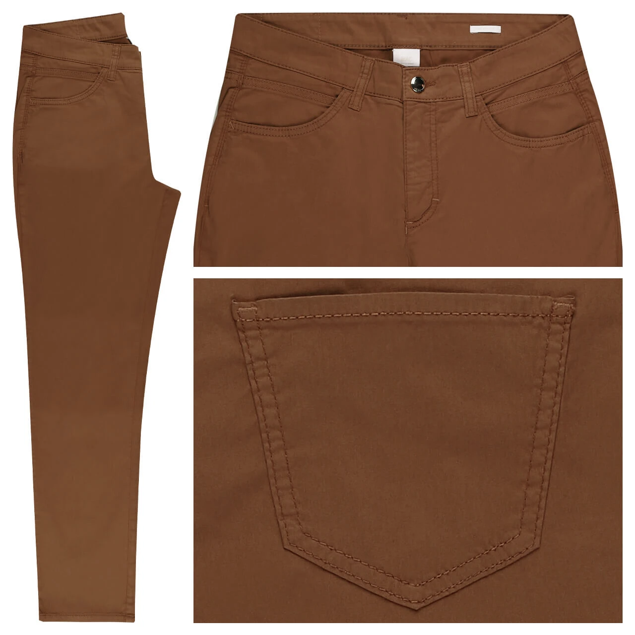 Ein zartes Braun mit gleichfarbigen Nähten macht die MAC Melanie zu einer perfekten Begleitung, die vor allen Dingen durch ihr geringes Gewicht punktet. Der silberne Verschlussknopf zeigt sich als dezentes Highlight der Damenhose.