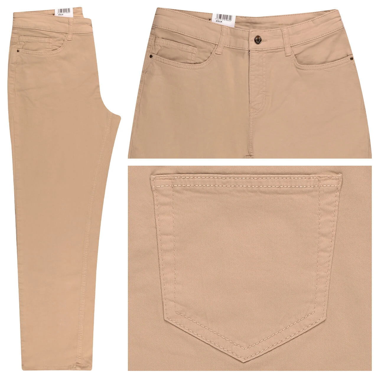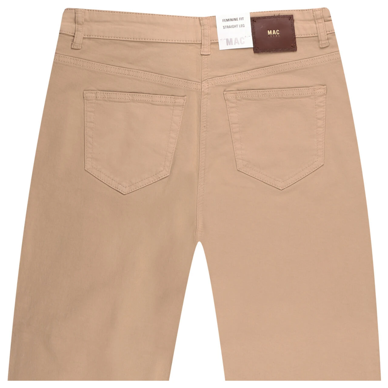 Die goldbraunen Details der MAC Stella harmonieren 1A mit den zarten Beigebraun der Damenjeans – der dunkle Patch auf der Rückseite, der sich mit einer geprägten Bordüre abhebt, setzt einen kräftigen Kontrast.
