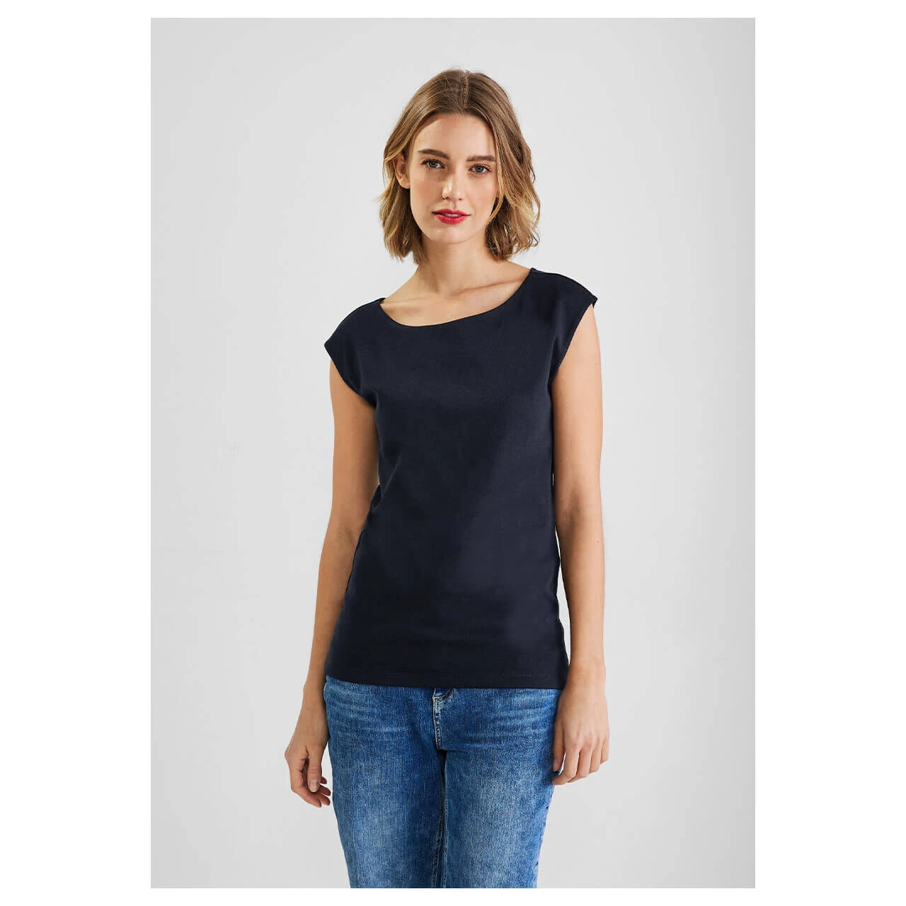 Joyful! Solides Damen T-Shirt im Style Ada von Street One. Im femininen Fit überzeugt es mit U-Boot Ausschnitt und leicht überschnittenen Schultern. Die zahlreichen Unifarben laden zum Kombinieren ein.