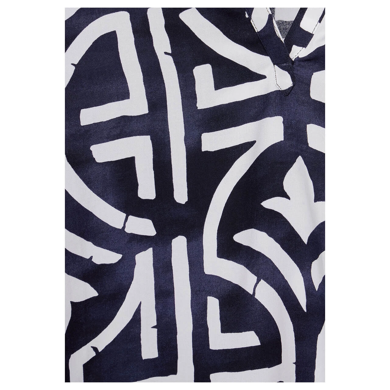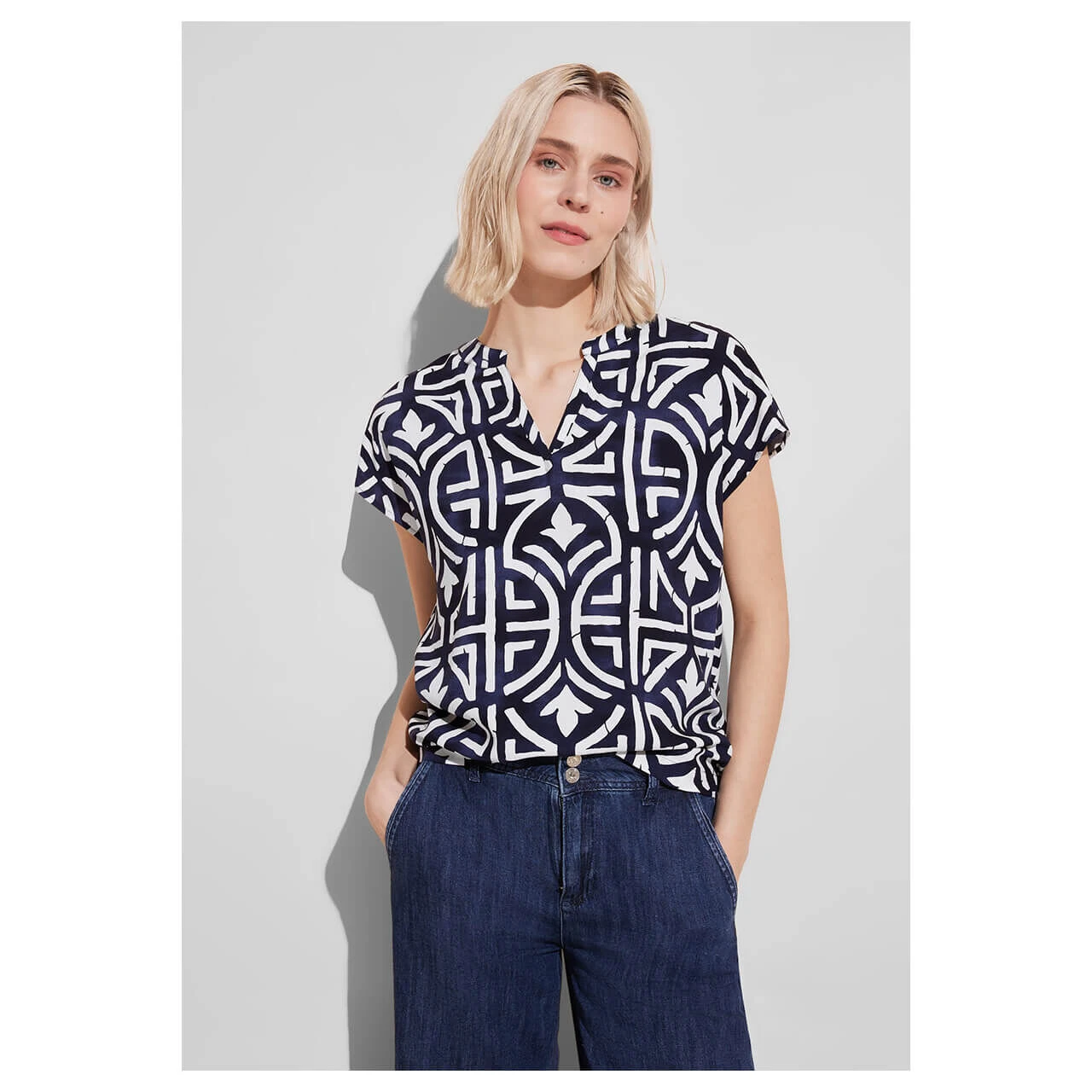 Die Damen Bluse von Street One präsentiert sich mit einem geschlitzten Ausschnitt und einer angenehm weichen Viskose-Qualität. Ihr grafisches Muster verleiht ihr eine sommerlich leichte Note, perfekt für die warmen Tage. Dieses Blusenshirt vereint Stil und Komfort für einen eleganten Look.
