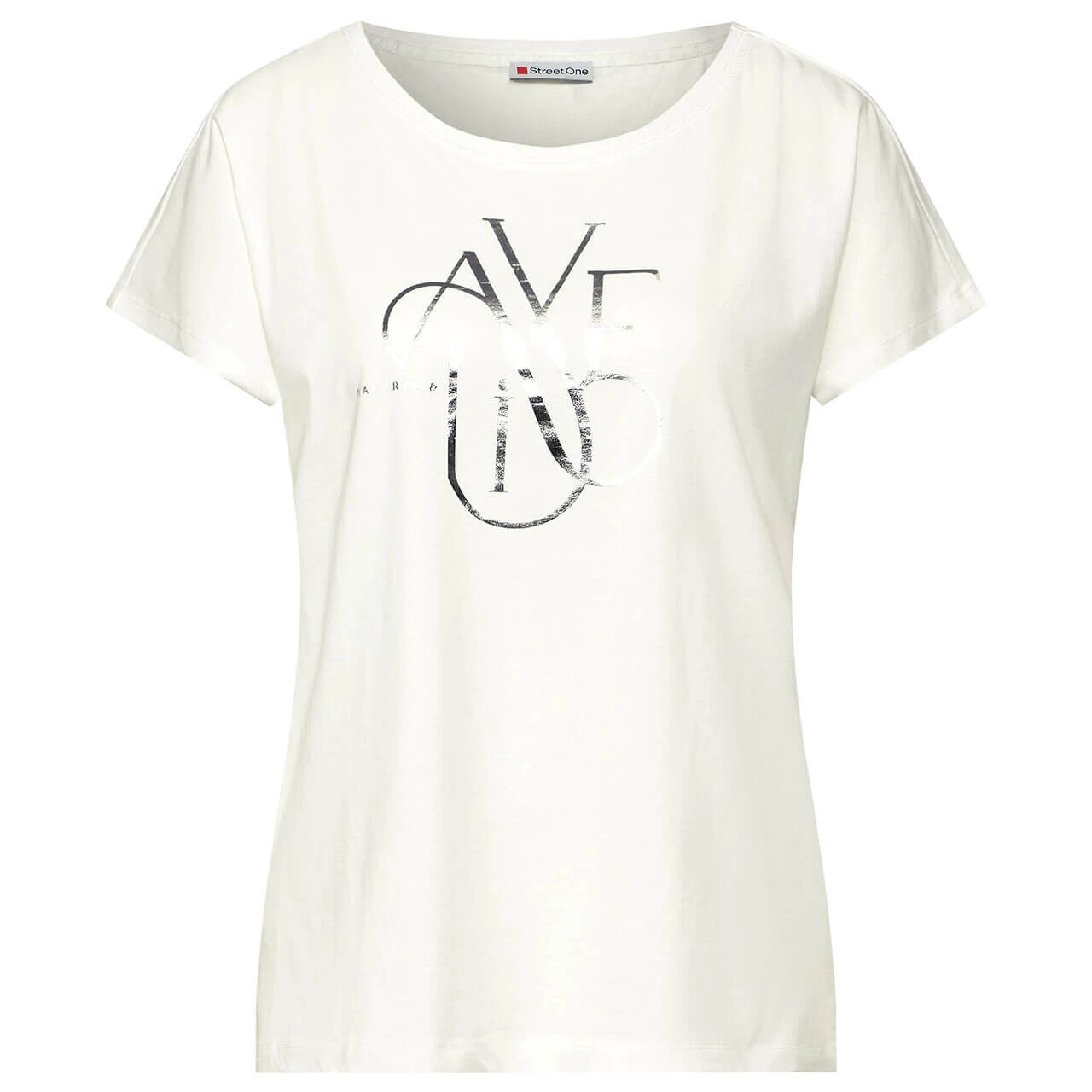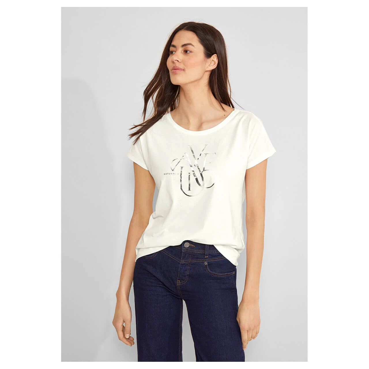 Das Damen T-Shirt von Street One hat ein cooles Schimmer-Wording. Aus einer angenehmen Baumwoll-Modalmischung bietet es einen bequemen und zugleich trendigen Look für den Alltag. Ein vielseitiges Piece mit überschnittenen Schultern, das sich leicht kombinieren lässt und jedem Outfit eine besondere Note verleiht.