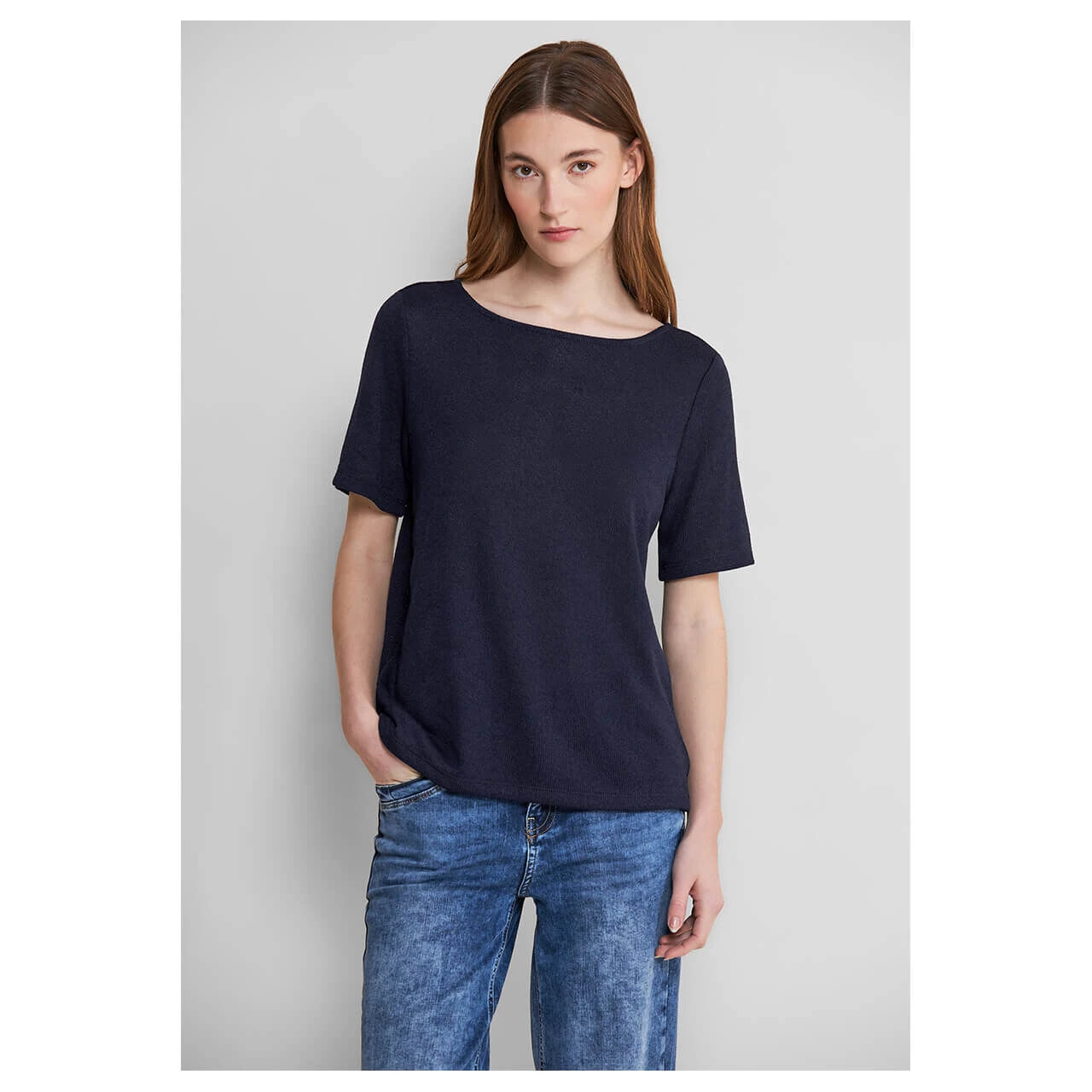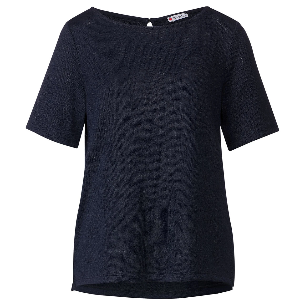 Das Damen T-Shirt von Street One ist ein vielseitiges Oberteil in einem coolen Stricklook. Der Schlitz und der Knopf im Nacken sorgen für raffinierte Details, während der softe Materialmix für angenehmen Tragekomfort steht.