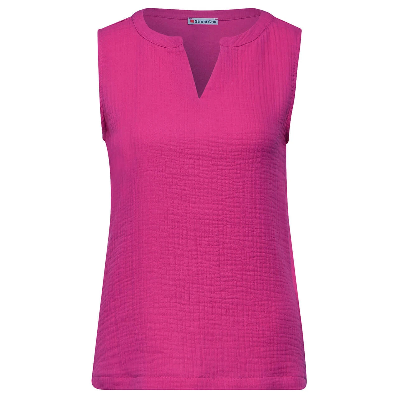 Das Musselin Damen Top von Street One ist ein sommerliches Must-have, das mit seinem geschlitzten Ausschnitt und der soften Blusenfront einen eleganten Look verleiht. Dank des bequemen Shirtrückens bietet es optimalen Komfort für den ganzen Tag. Pflegeleicht und dennoch schick, ist dieses unifarbene Top die ideale Wahl für stilvolle Sommeroutfits.