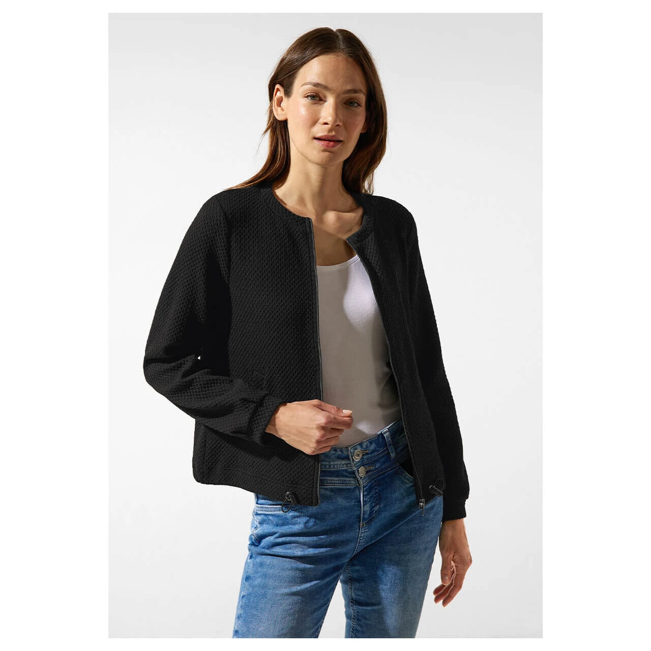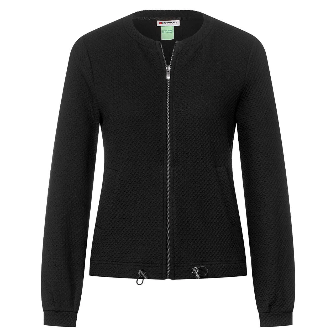 Stay cosy! Die Street One Damenjacke mit strukturierter Optik überzeugt. Mit Zipper und Tunnelzug im Bund ist sie die perfekte Wahl für einen lässigen und bequemen Look. Mit praktischen Eingrifftaschen ist die Sweatjacke ein Allrounder und lässt sich jederzeit überziehen!