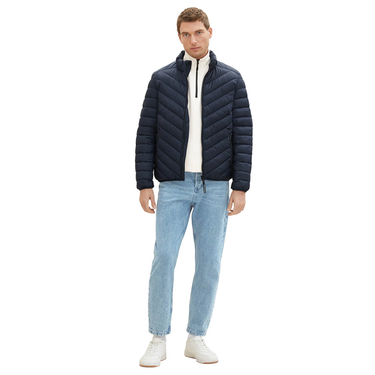 Die Steppung wirkt bei der Tom Tailor Herrenjacke besonders sportlich, da sie auf der Brust und am Rücken im Fischgrätenmuster verläuft. Aus Komfortgründen ist der Stehkragen mit einem Kinnschutz ausgestattet. Die Übergangsjacke hat ein super softes Obermaterial und zwei verschließbare Außentaschen!