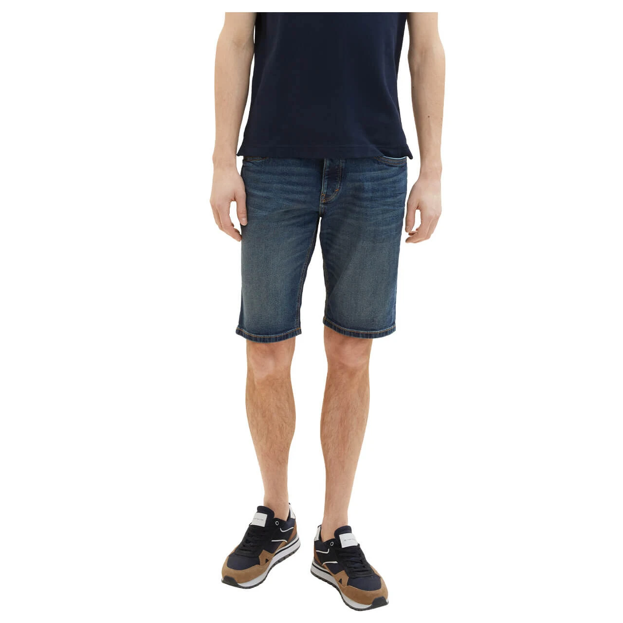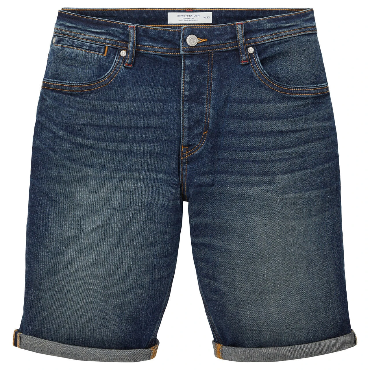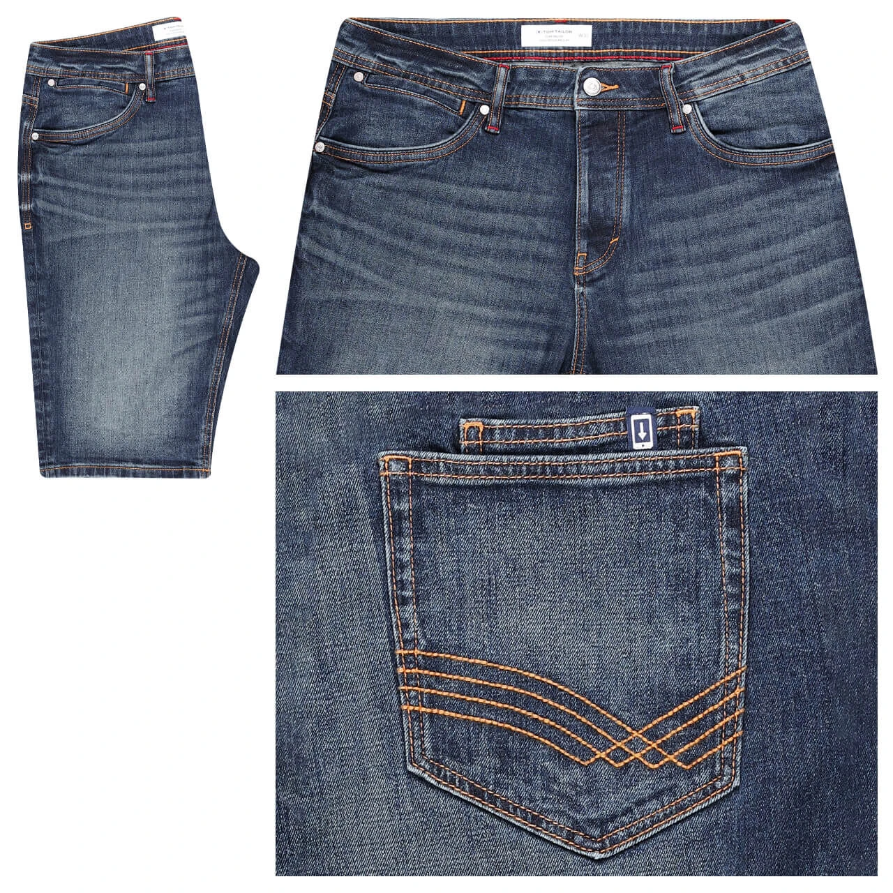 Wenn Sie einen Platz für Ihr Smartphone suchen, finden Sie ihn bei der Tom Tailor Josh in der Gesäßtasche: Dort gibt es extra eine Tasche für das Handy. Nicht nur funktional, sondern auch optisch hat es die Herrenjeans in Bermudalänge drauf: Das dunkle, leicht angewaschene Blau kontrastieren braune und rote Nähte.