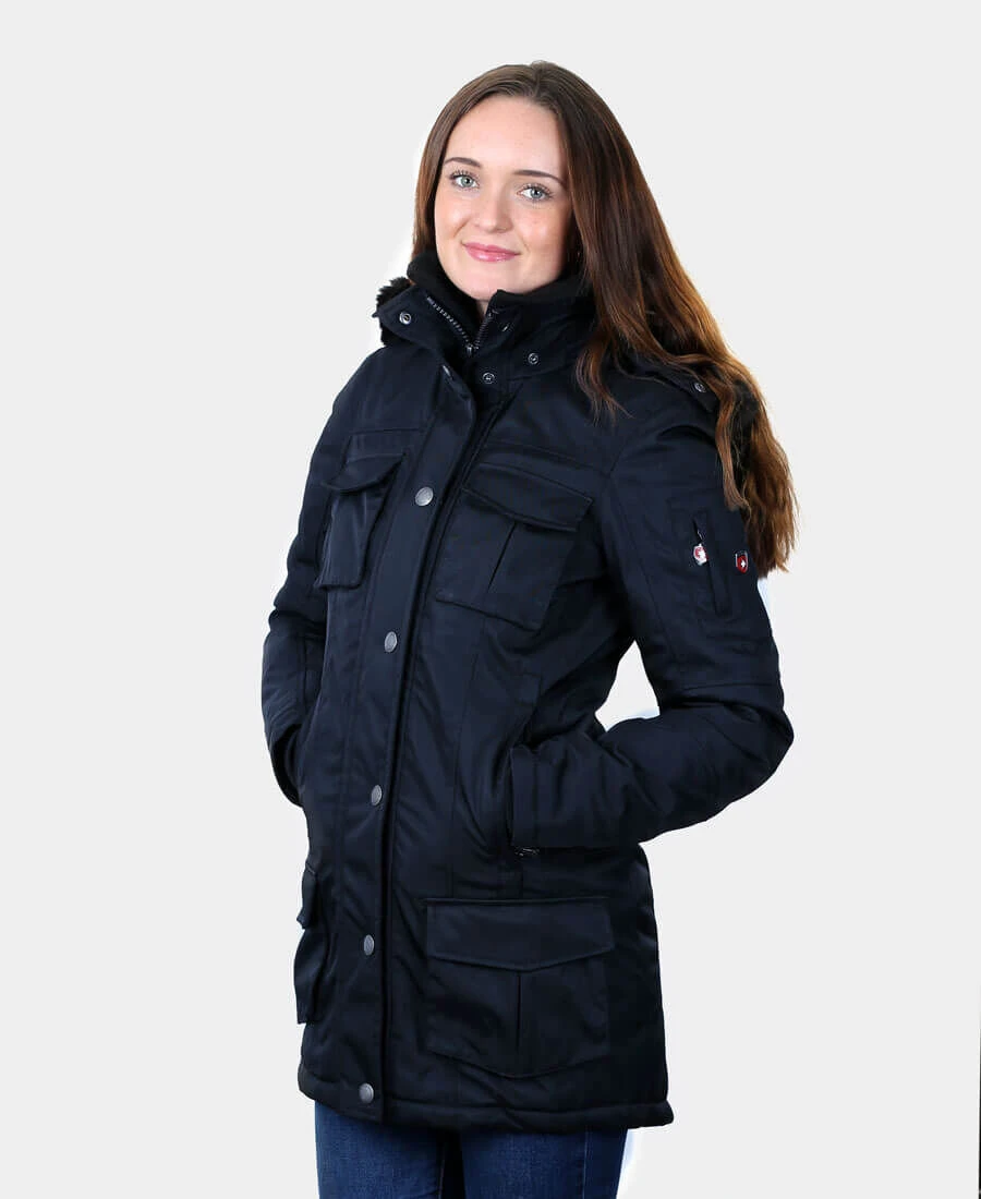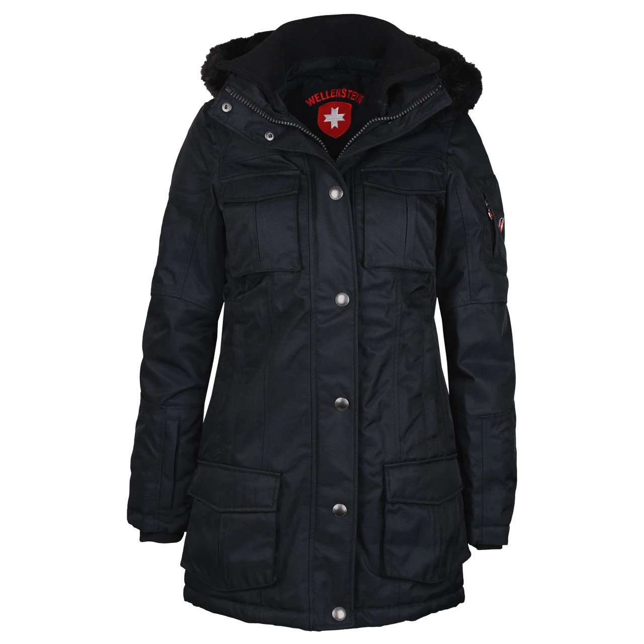 Wellensteyn Schneezauber gehört mit zu den beliebtesten Modellen bei der Marke und deswegen gibt es die Damen Winterjacke auch in ganz vielen verschiedenen Farben. Dieses mitternachtsblaue Modell lässt wie seine Kolleginnen keinen Wunsch offen: Die wetterfeste Funktionsjacke mit verschweißten Nähten hat eine abnehmbare, größenverstellbare Kapuze, die mit einem ebenfalls abnehmbaren Webpelz und einem super soften Teddyfell ausgestattet ist. Den inneren, schwarzen Stehkragen mit Rippmuster können Sie bei Bedarf abknöpfen und zu Hause lassen. Der Zwei-Wege-Reißverschluss ist mit zwei Blenden geschützt. Der taillierte, längere Schnitt, der am unteren Rücken angeschlitzt und mit Nieten verziert ist, hält Sie zusammen mit den Ärmelbündchen und dem Teddyfell auf der Innenseite herrlich warm. Einen Mangel an Taschen kann es bei der Schneezauber übrigens niemals geben: Neben einer Innentasche haben Sie zwei Pockets am Bauch, eine neben dem Reißverschluss, eine am Handgelenk und eine auf der Schulter, die allesamt mit einem Zipper verschließbar sind. Die insgesamt vier Brust- und Hüfttaschen tragen Druckknöpfe. Unter der Funktionsjacke mit glatter Oberfläche reicht oft ein dünneres Langarmshirt, zum Beispiel mit Vögeln bedruckt!